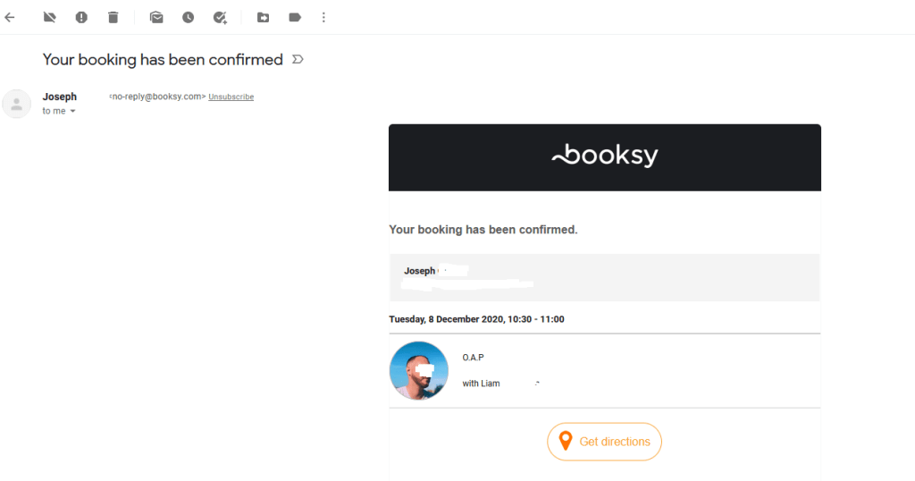 So, here I am. And I am really confused. Totally derailed. My whole shtick as it is, is emails to Sarahs, and how people get their emails wrong. This is a Joseph and a Liam. Not even close. Even their surnames are not close. Even more confusingly, it seems that the person, Joseph who signed themselves up, who booked – what turns out to be an O.A.P haircut with Liam, is the person who input their details incorrectly.